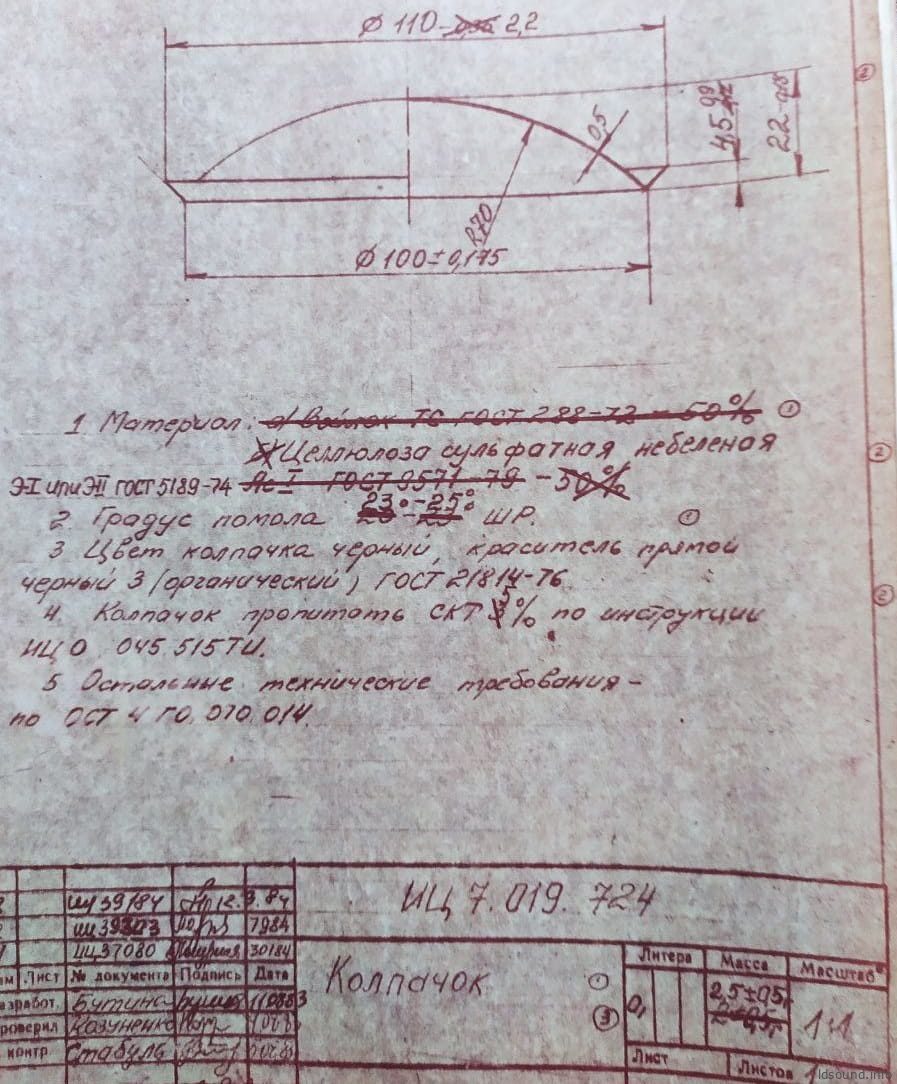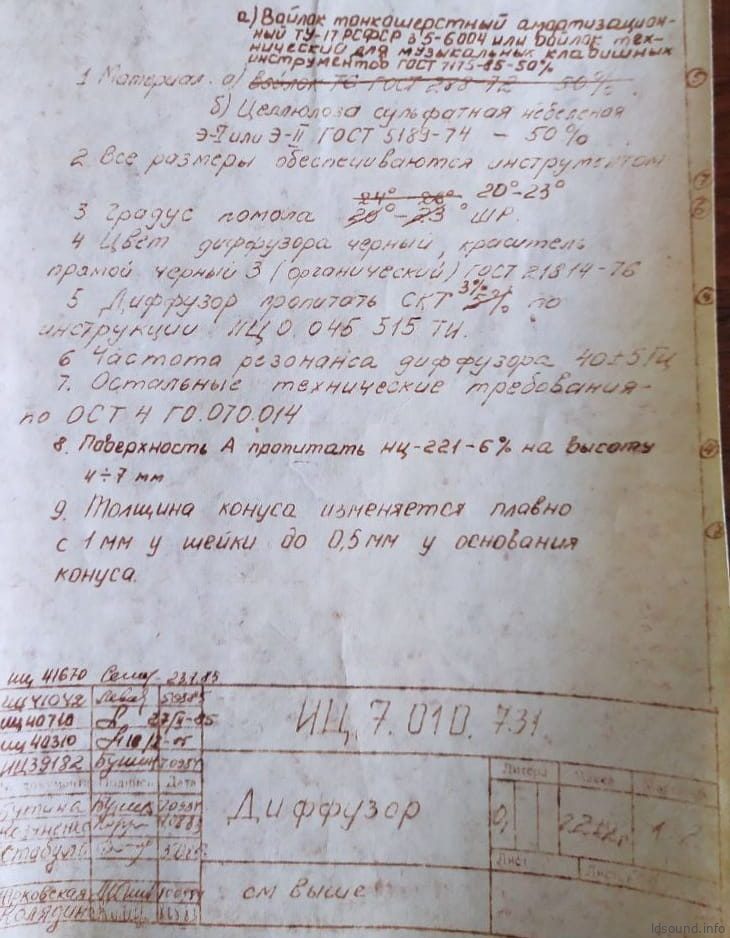 - Диффузор с тангенциальным подвесом изготовлен в пропорции 50/50 из небеленой сульфатной целлюлозы и войлока тонкошерстного амортизационного (или войлока технического для музыкальных клавишных инструментов). Внешне диффузор окрашен в черный цвет, краситель – черный 3 (органический). Пропитан составом СКТ 3%. Лицевая сторона пропитана лаком НЦ-221-6% на высоту 4-7 мм. Толщина конуса изменяется плавно с 1 мм у шейки и до 0,5 мм у основания конуса. Вес диффузора – 22 г (±2 г).