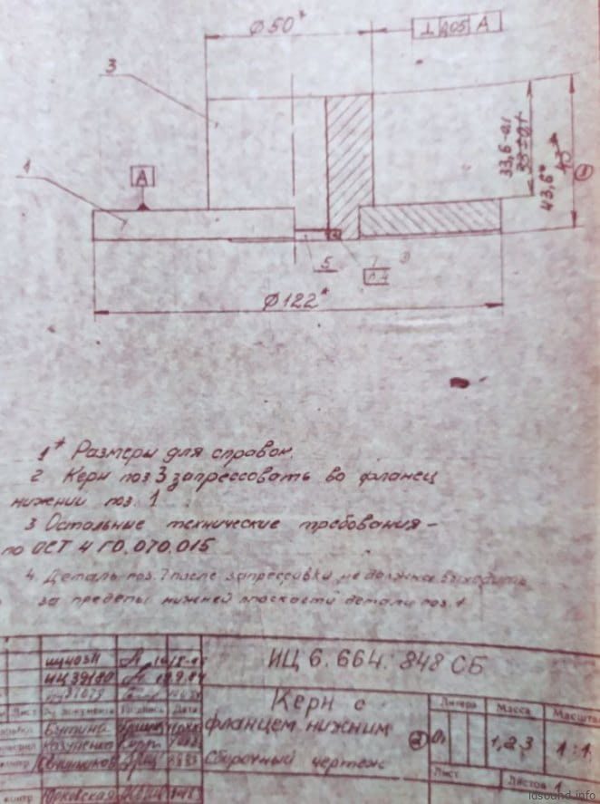 - Керн диаметром 50 мм, его высота над нижним фланцем – 33,6 мм. Внутри керна отверстие диаметром 20 мм. Деталь покрыта защитным слоем Ц15хр. Масса – 0,48 кг. Керн запрессован в нижний фланец.